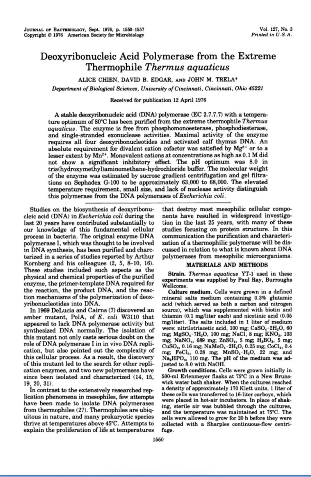 于是穆利斯的团队开始发掘耐热的菌种,最后在一篇1976年发表于《细菌学期刊》(Journal of Bacteriology)的论文挖到了宝。论文中提到黄石公园的热泉里有种水生栖热菌在70℃的高温下仍能正常繁殖,他们已从中分离出耐高温的Taq DNA聚合酶(Taq是用该菌名称Thermus aquaticus的字首结合而成)。更棒的是,里面还详述分离纯化的步骤以及此酶的相关特性,例如复制DNA的最适温度、最适pH值、需用二价镁离子辅助等等。